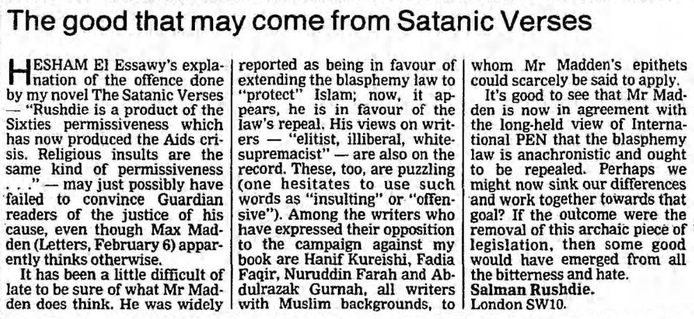 Unabashed by all the offence he had caused, Rushdie wrote a letter to the Guardian advocating the scrapping of blasphemy laws (to make books like his less legally risky to publish) and mocking his opponents Hesham El Essawy and Max Madden: