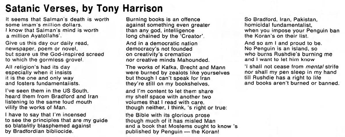 Another part of the poem deals - smugly - with the threat some outraged Muslims had made to boycott Penguin Books. Harrison thinks these Muslims would be shooting themselves in the foot, since their boycott would mean they couldn’t buy copies of a book very dear to them: